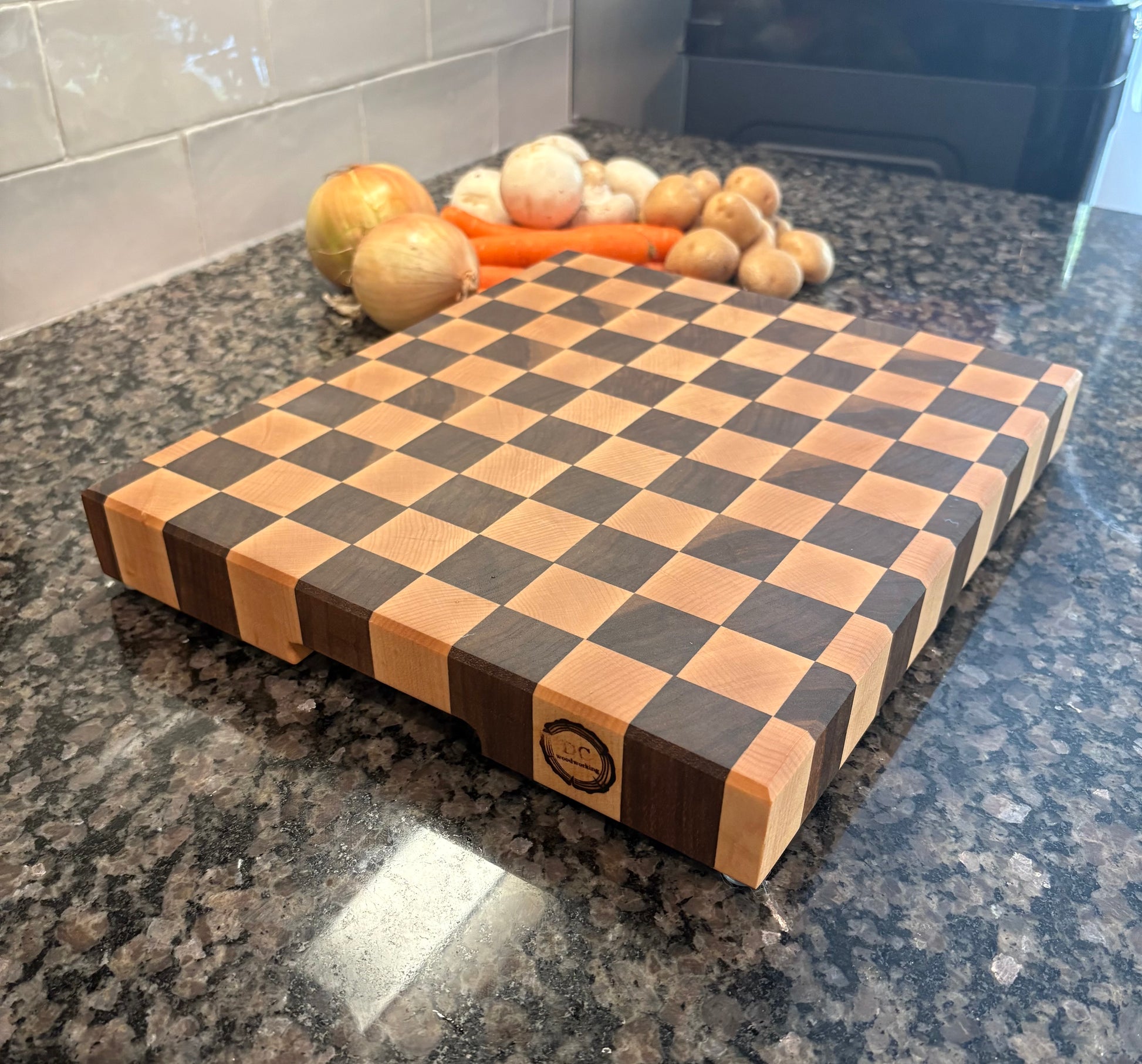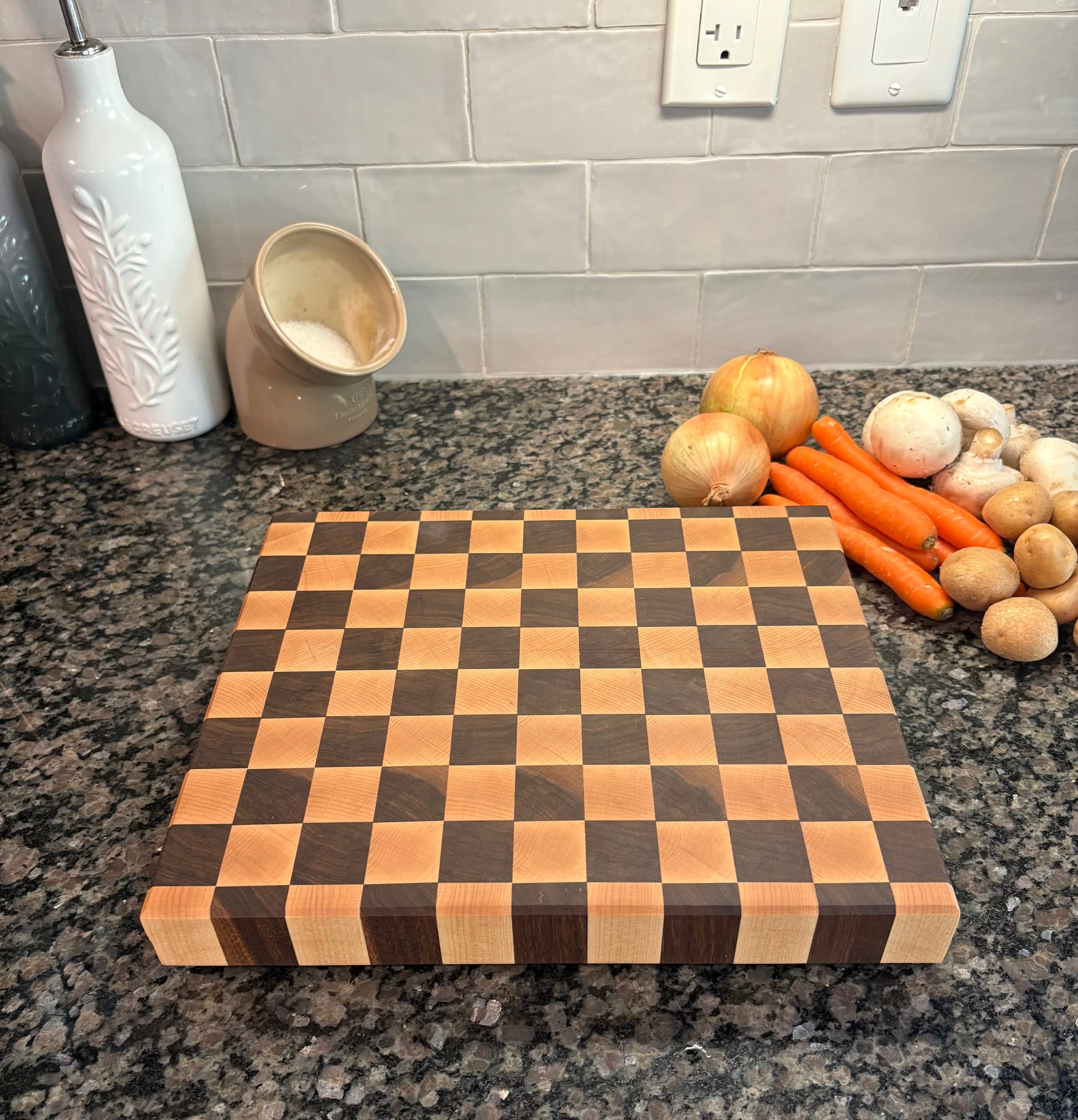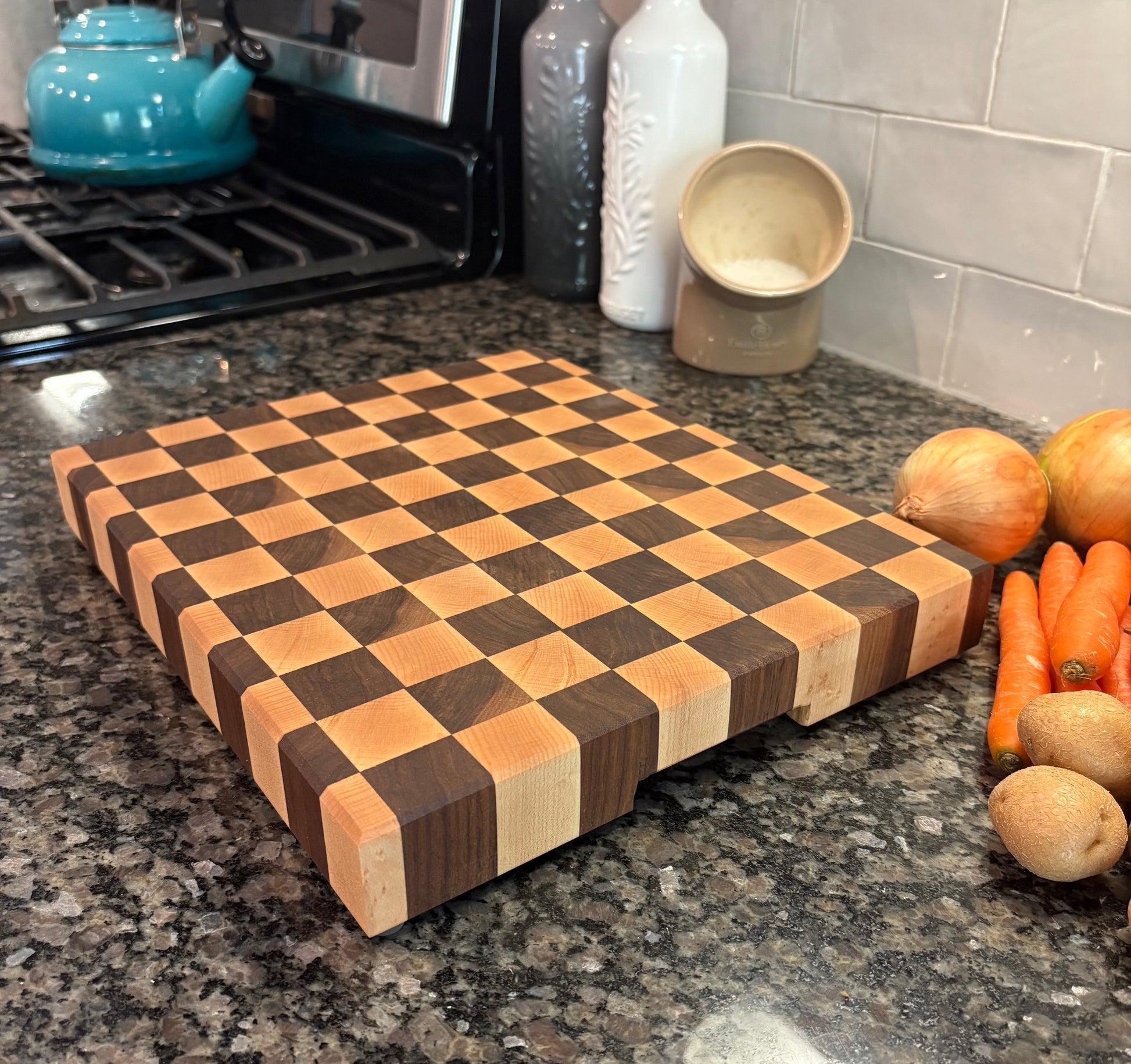 Crafted from rich Walnut and warm Oak, this Twin Grain Checkerboard cutting board blends durability with timeless beauty.
