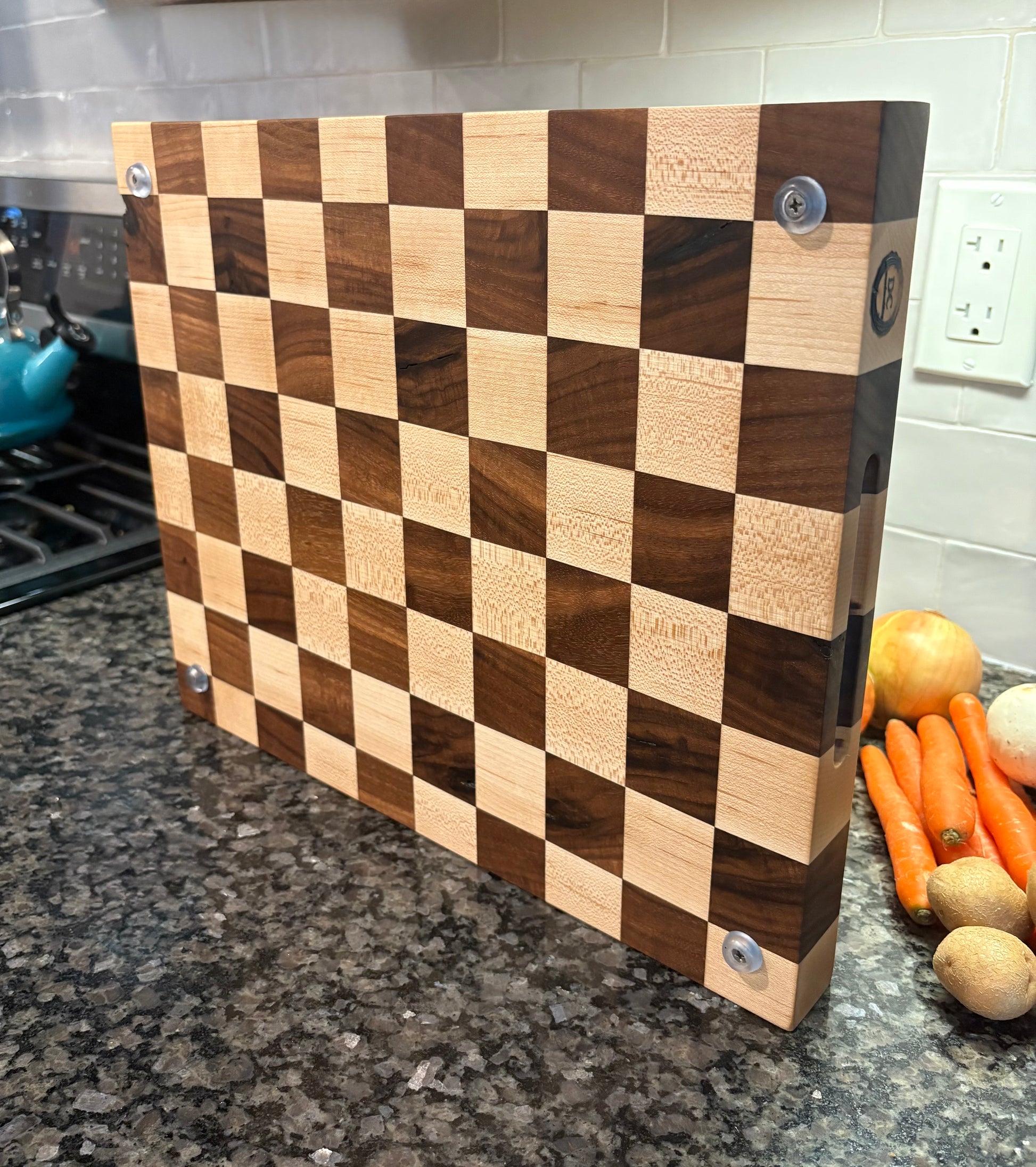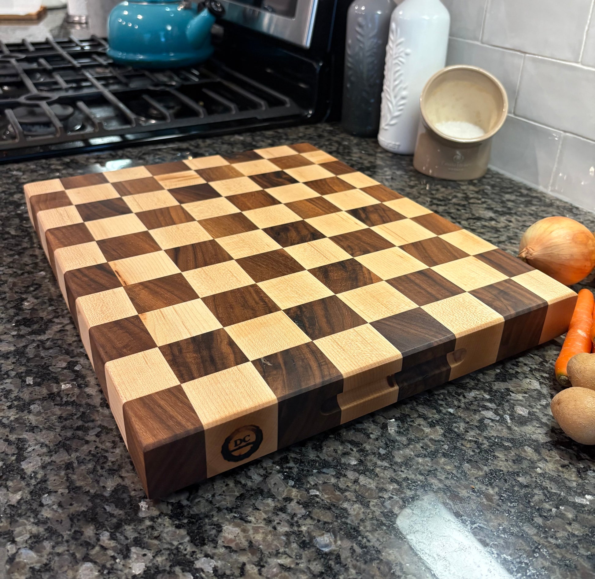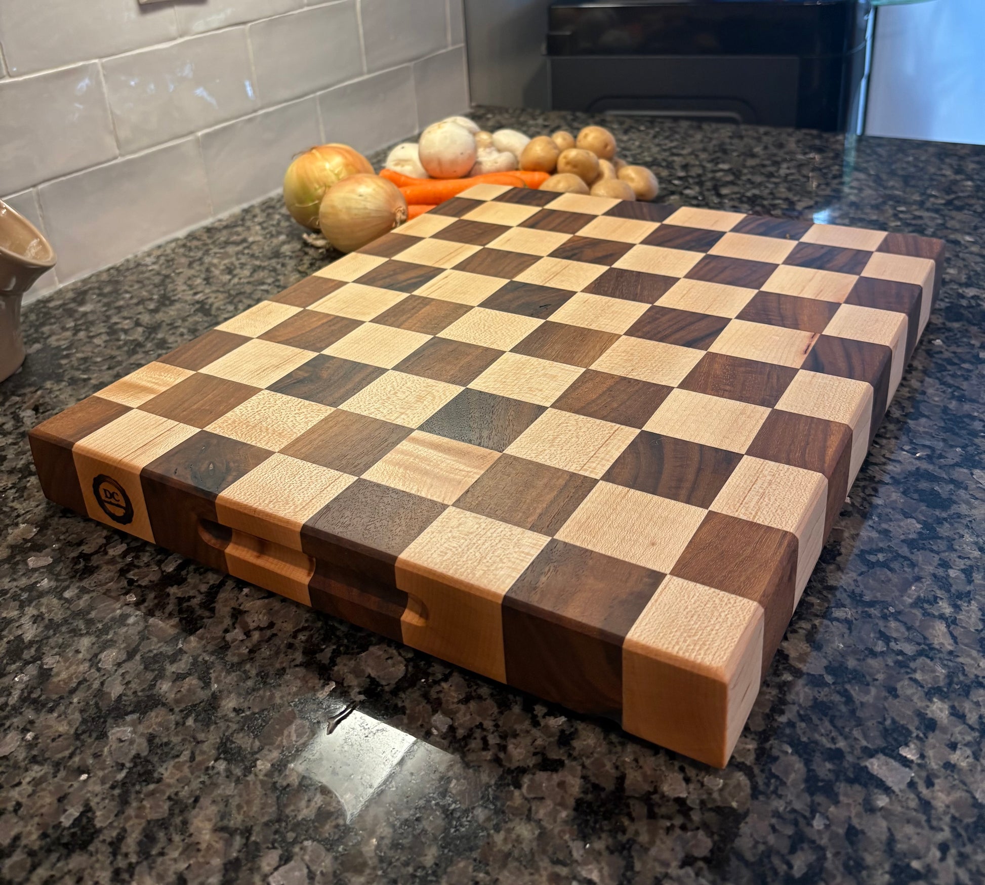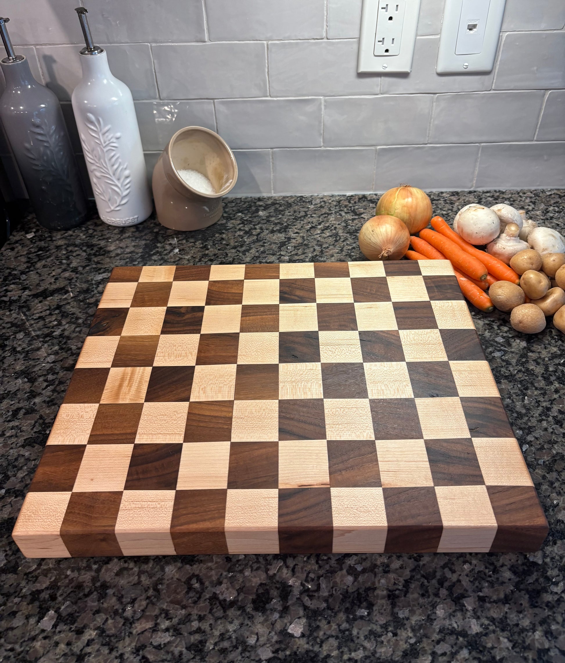 Crafted from rich Walnut and light Oak, this checkerboard cutting board combines durability with timeless elegance.