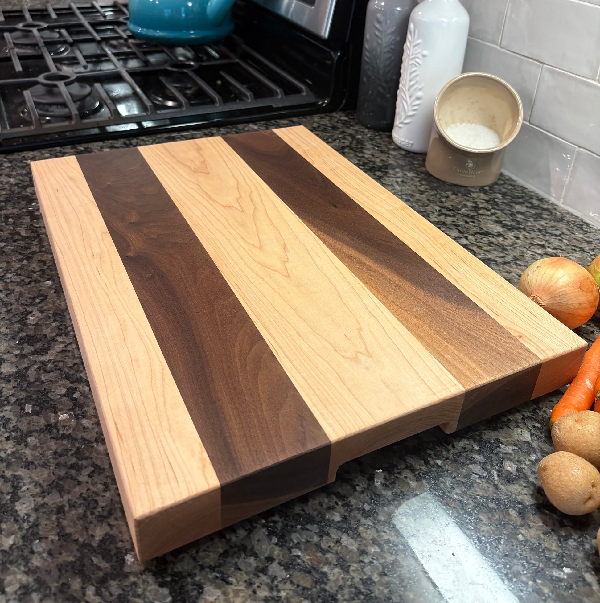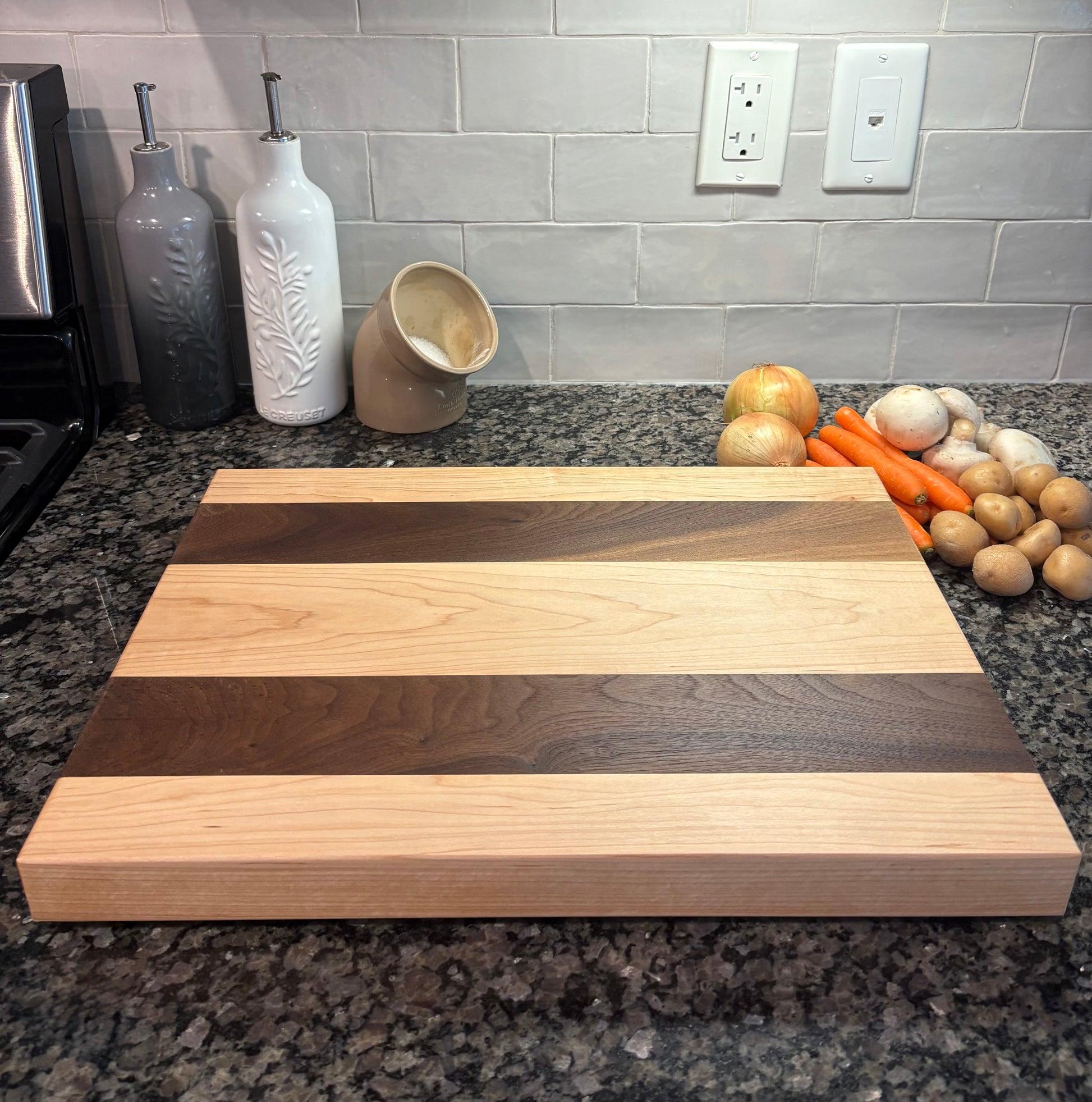 The rich walnut paired with light maple not only offers a stunning contrast but also provides a sturdy, knife-friendly surface. Perfect for meal prep or serving, this cutting board combines functionality with elegance to enhance every culinary task.